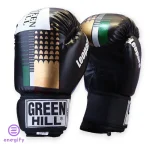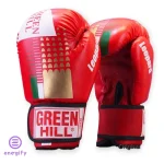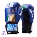 دستکش بوکس گرین هیل با فوم تزریقی درجه یک، تولید پاکستان، در سایزهای ۱۰ و ۱۲ و رنگبندیهای آبی-طلایی، مشکی-طلایی، و قرمز-طلایی.