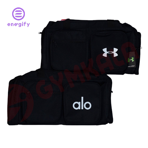 ساک دو جیب ALO با جنس برزنتی و کیفیت درجه یک، طراحی جذاب و تک رنگ مشکی. مناسب برای حمل لوازم ورزشی و روزمره.